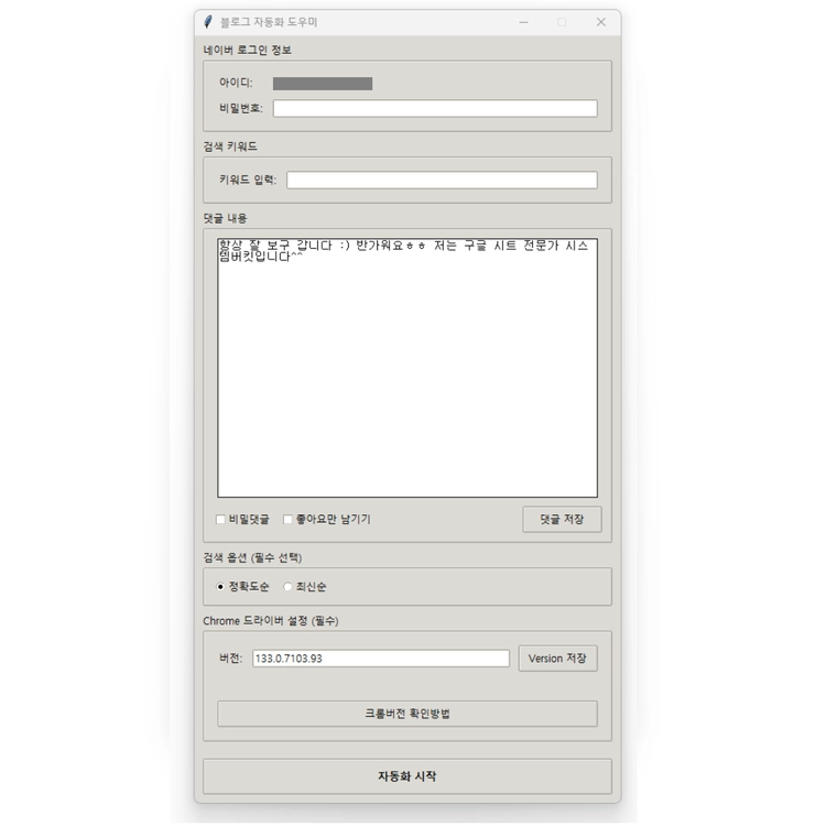 특정 키워드를 검색 결과로 나오는 최신 블로그 글에 자동으로 접속하고 공감과 댓글을 남겨주는 프로그램입니다.